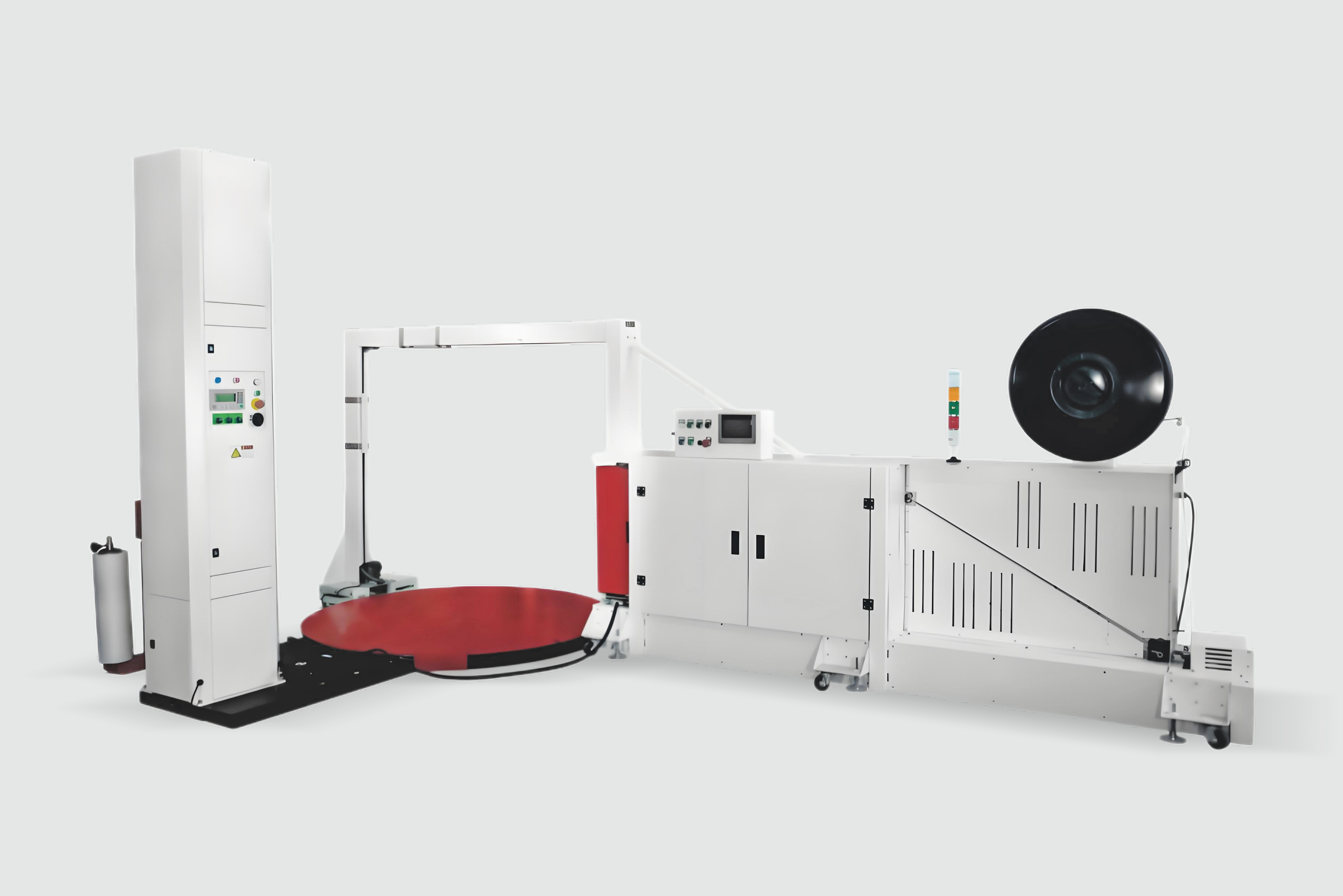 栈板缠绕机+栈板打包机一体机,有效用缠绕膜以及PP带固定产品,确保货物在运转过程中的平稳与安全。
